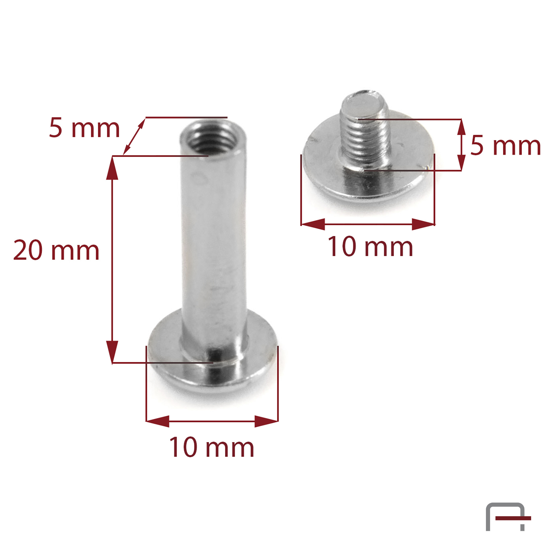 Wymiary nita skręcanego: średnica główki (trzpień): 10 mm, średnica główki (śrubka): 10 mm, wysokość nóżki (trzpień): 20 mm, wysokość śrubki: 5 mm